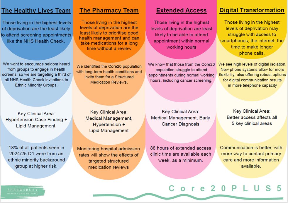 At Shrewsbury Primary Care Network, we are committed to reducing healthcare inequalities and delivering fair and equitable care to all our patients. That’s why we embed the Core20PLUS5 approach across everything we do.